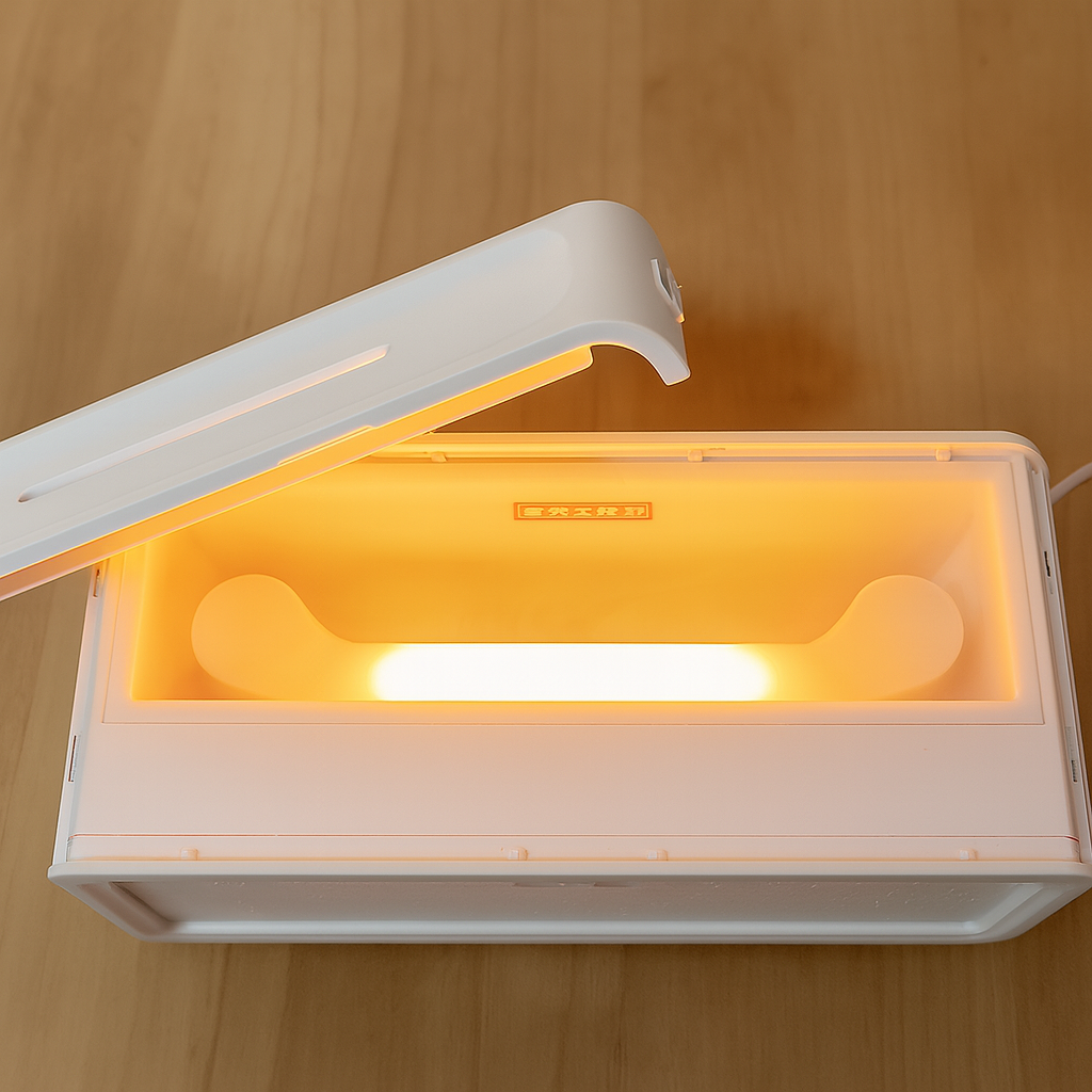 - Footprint: compact bedside size (~7.9" W × 5.1" H × 3.5" D).