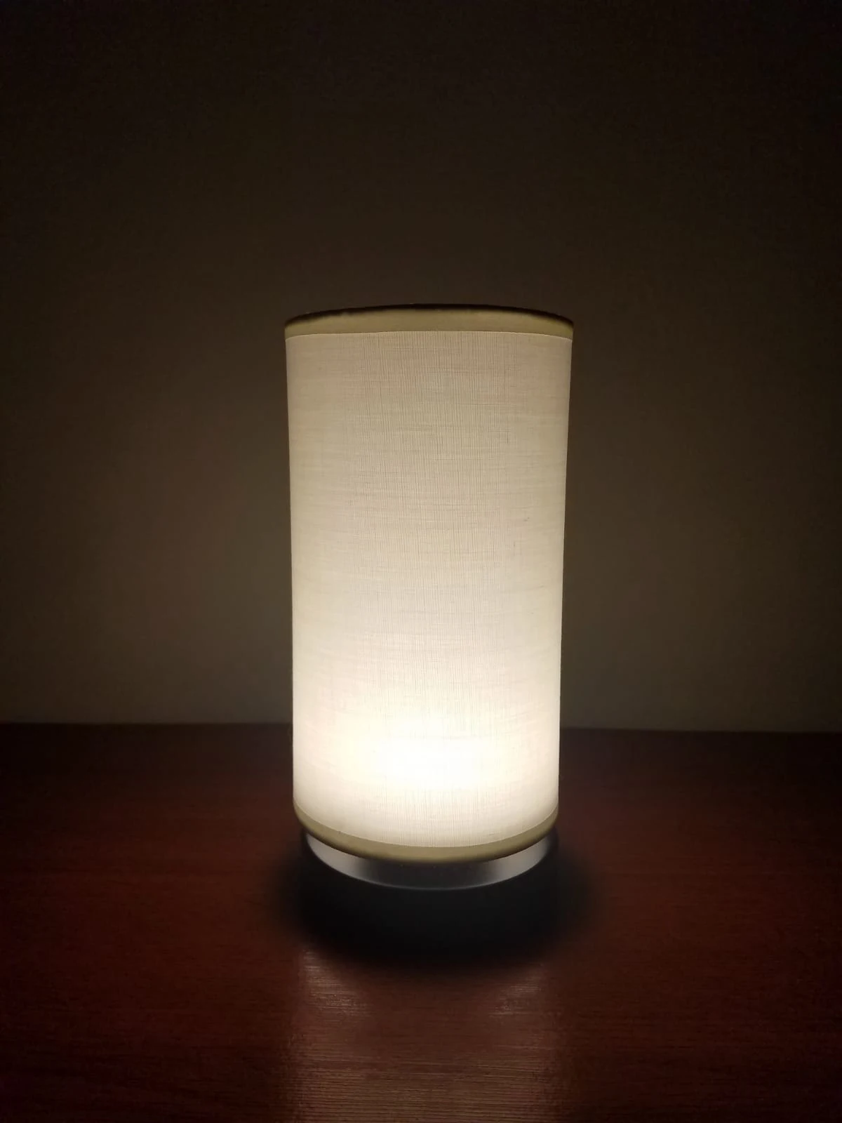 - Design: minimalist cylindrical fabric/linen lampshade with compact base.